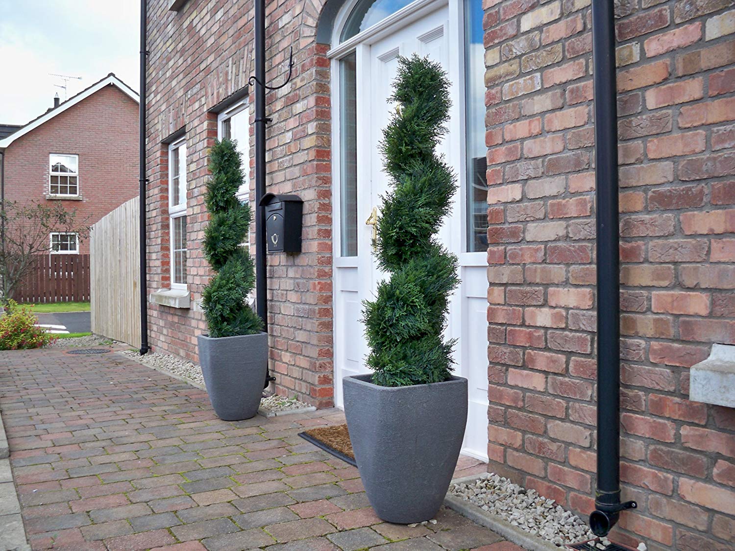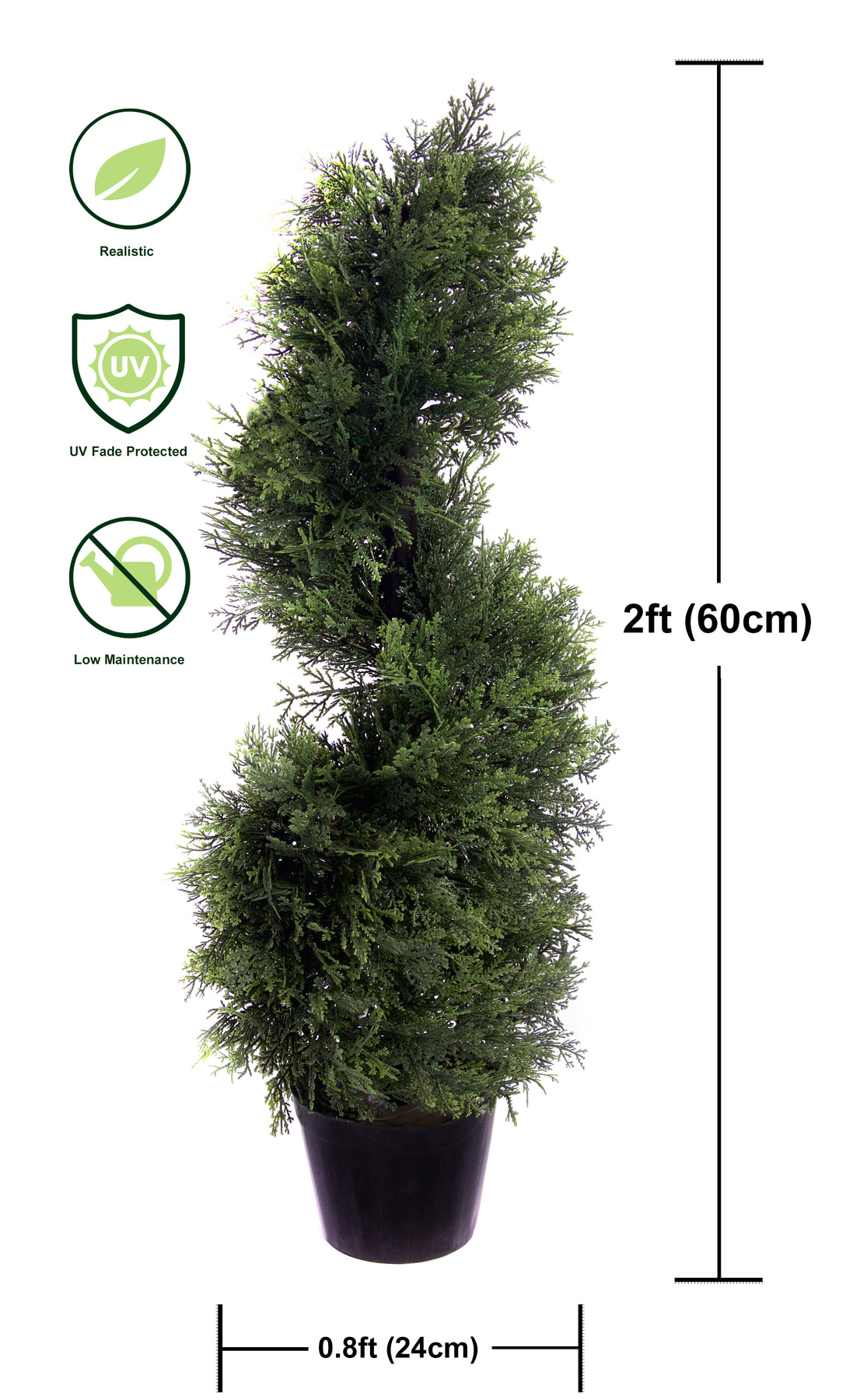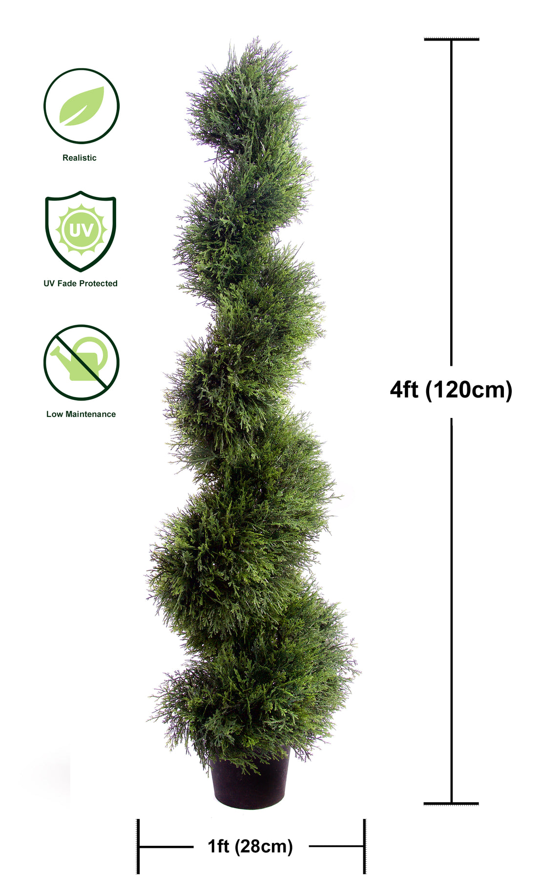 Our Cedar Spiral Tree is crafted with top-quality materials on a sturdy metal frame and adorned with incredibly lifelike leaves. Just like all our products, it's built to withstand the elements and maintain its vibrant colour. Measures from bottom of pot to top of tree. Durable metal frame for long-lasting use. Realistic full leaf coverage. Perfect for outdoor spaces. No upkeep necessary. Shown in picture one, grey planters not included.