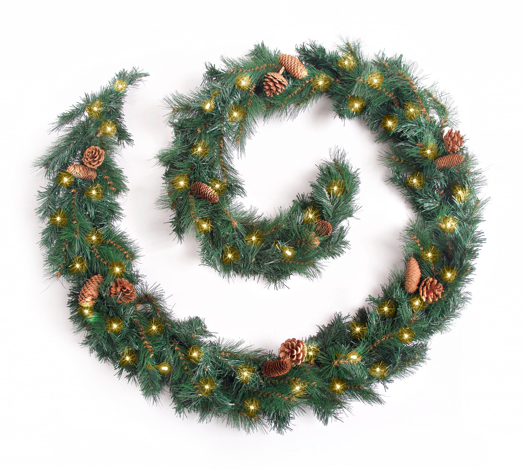 • 9ft / 270cm in Length with 16 Pine Cones attached. (215 tips). Can be supplied with 80 Warm White LED Lights (if selected).