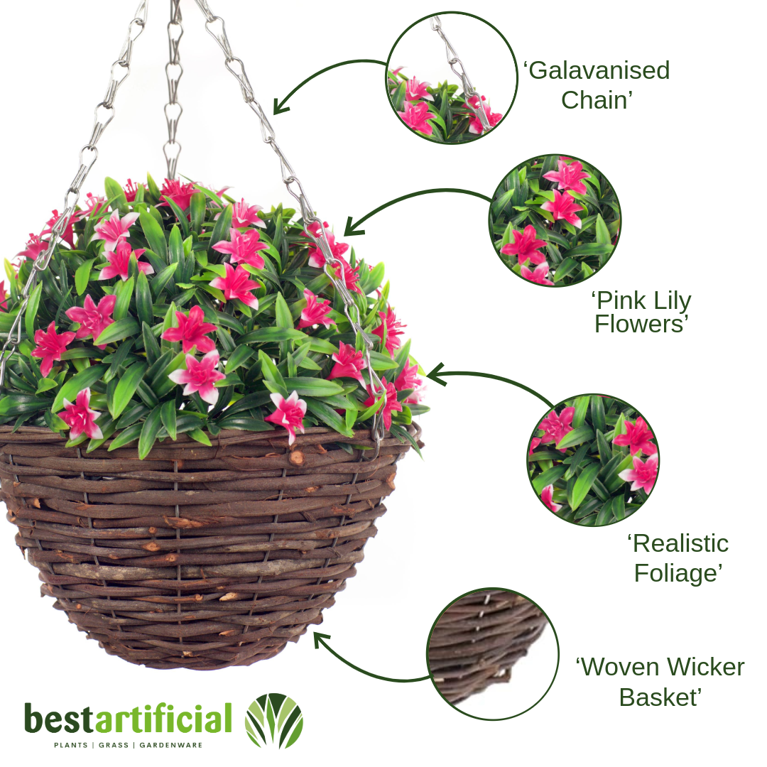 Best Artificial 28cm Lily Hanging Basket - Suitable for Outdoor Use - Weather Resistant (Pink)