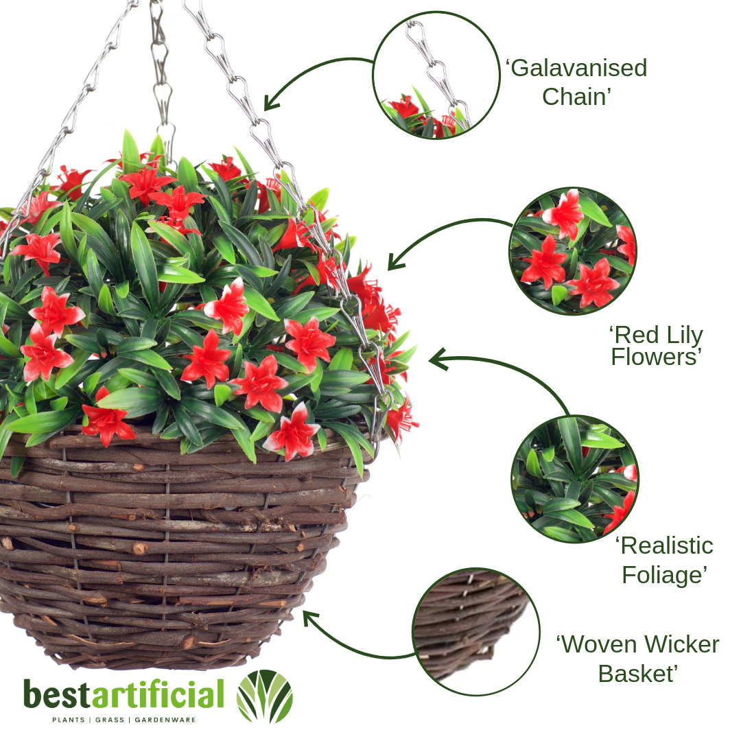 Best Artificial 28cm Lily Hanging Basket - Suitable for Outdoor Use - Weather Resistant (Red)