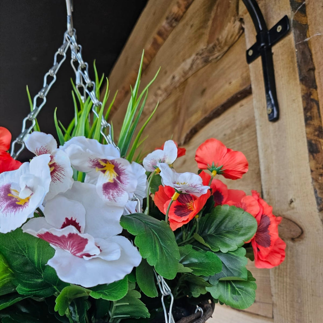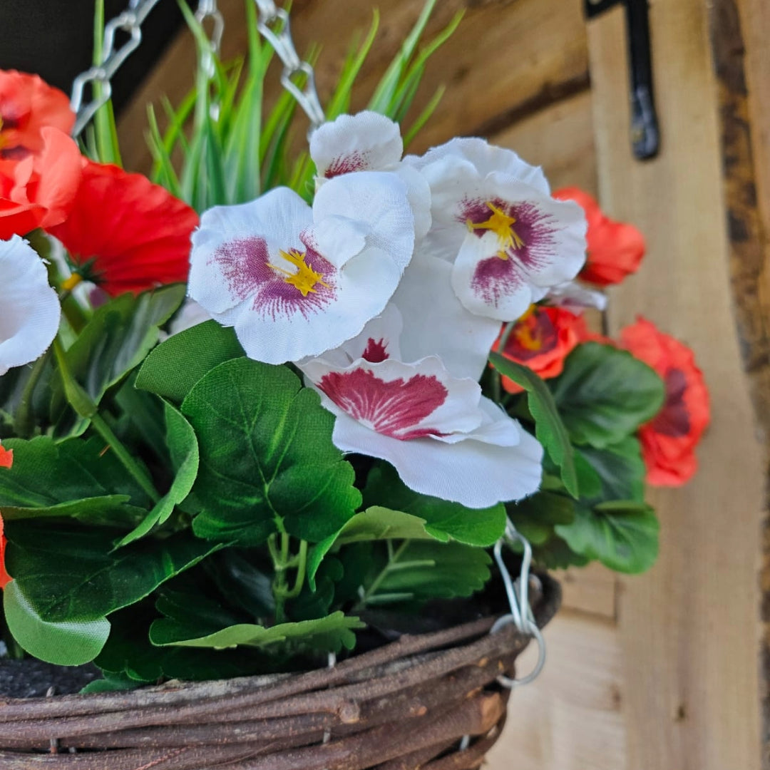 Best Artificial 30cm Pansy and Geranium Hanging Basket - Suitable for Outdoor Use - Weather Resistant (Red & White)