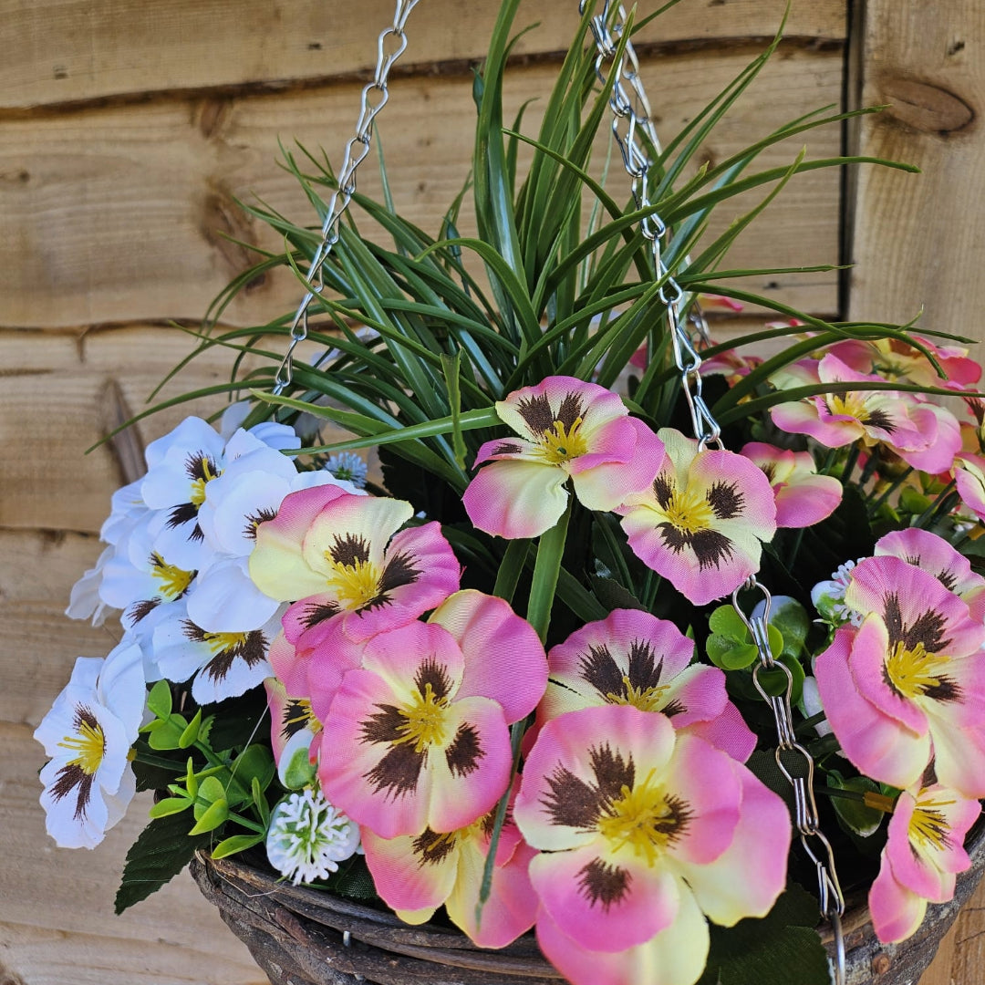 Best Artificial Pink & White Pansy and Geranium Display in 14 inch Round Wicker Hanging Basket - Suitable For Outdoors