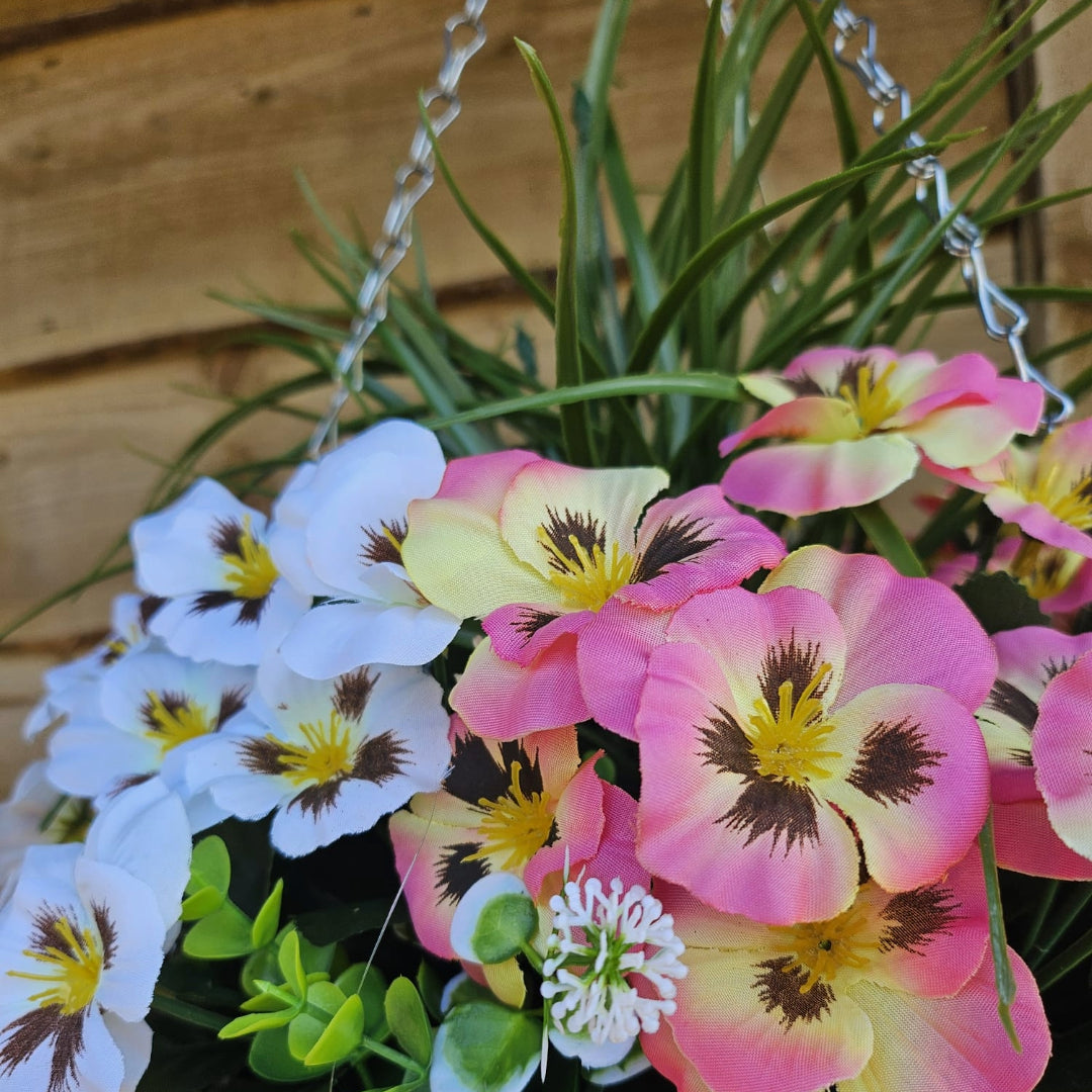 Discover the perfect pop of color for your outdoor space with our Best Artificial Pink & White Pansy Display. This lifelike display features a 14 inch round wicker hanging basket, adding a touch of natural beauty to your home. Suitable for outdoor use, it's the perfect addition to any garden or porch.