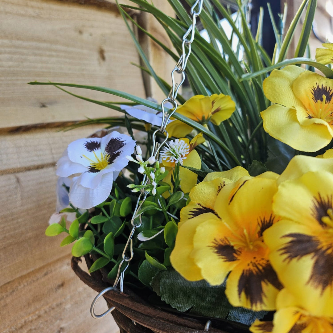 Best Artificial Yellow & White Pansy and Geranium Display in 14 inch Round Wicker Hanging Basket - Suitable For Outdoors